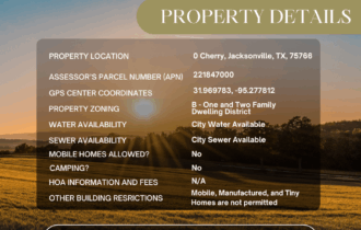 Cherokee County doesn’t shout—it sings. It’s the soft rustle of wind through the pines. The stillness of a lake at dawn. The pride of owning your own little slice of East Texas where the rules are few, and the stars shine brighter. Whether you’re investing in tomorrow or simply craving a place that feels like home, this land invites you to plant roots—and let them run deep.