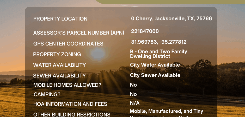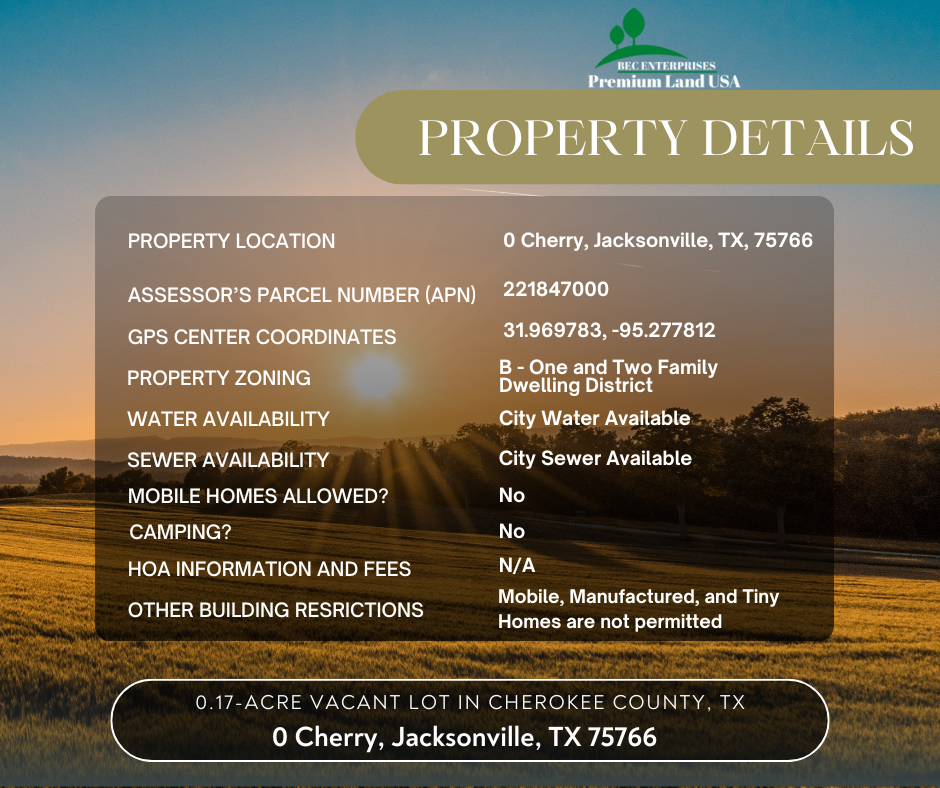 0 Cherry St, Jacksonville, TX, 75766: 0.17-Acre with Paved Road Access, Utilities Available (Only Site-Built Homes are Allowed)
